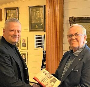 Föreningens ordförande Göran Bruun överlämnar en bok som tack till Toni Joutsia Foto: Hans Nurmi