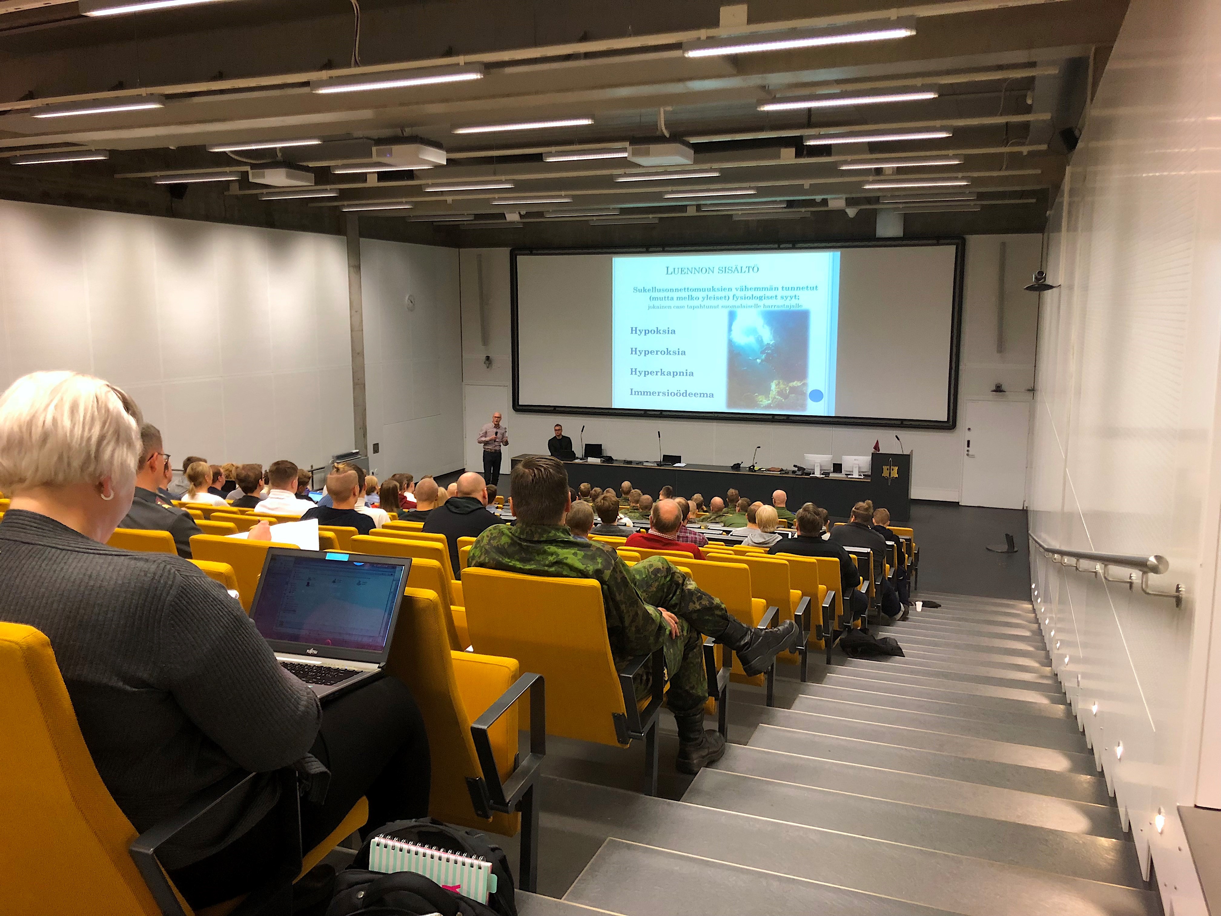 Kuva: Mikko Myllylä. Reservin lääkintäupseereiden koulutuspäivä ”Lääkintää ääriolosuhteissa” syksyllä 2018 Santahamina-talossa. Tekniikkasukelluksen huippuosaaja Jouni Piispanen kertoo sukelluksen liittyvistä vaaratilanteista.