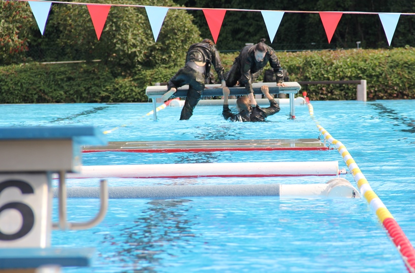 Iltapäivällä oli vuorossa esteuinti, missä uidaan maastopuku päällä 50 metrin rata. Matkalla on viisi estettä. Kisaisännän tarjoamat puvut olivat kohtuullisen nopeita. Mutta koska käytössä oli vain yksi rata, oli se hiukan hidas kolmelle kilpailijalle yhtäaikaa. Mutta kaikki pääsivät kunnialla maaliin. FIN2 oli tässä lajissa toiseksi nopein, häviten voittaneelle GBR1 joukkueelle hiukan reilun sekunnin. FIN2 voitti yhteenlasketun esteratapäivän ja saivat DEU3 joukkeen etumatkaa kurottua kiinni yli 200 pisteellä.