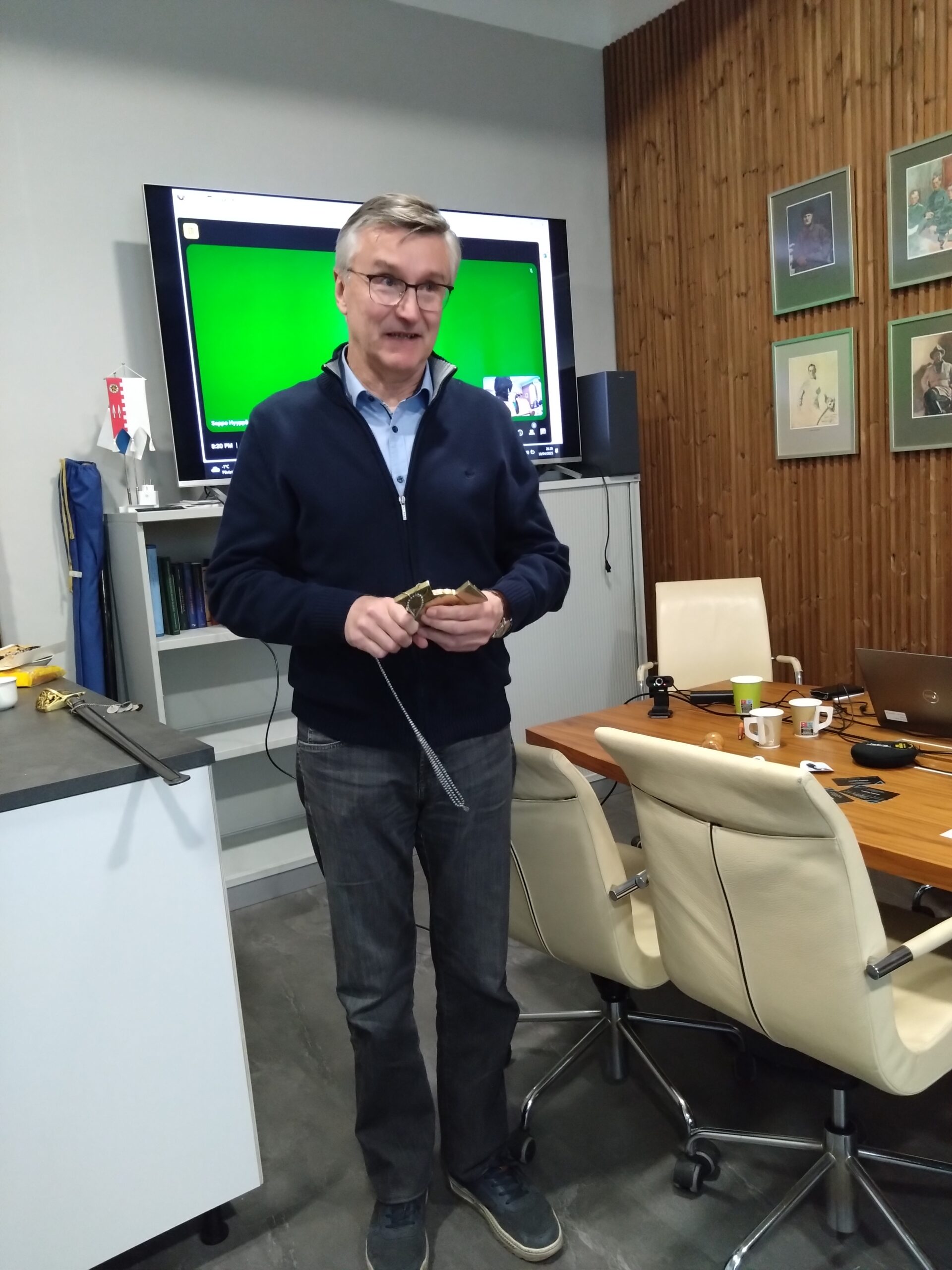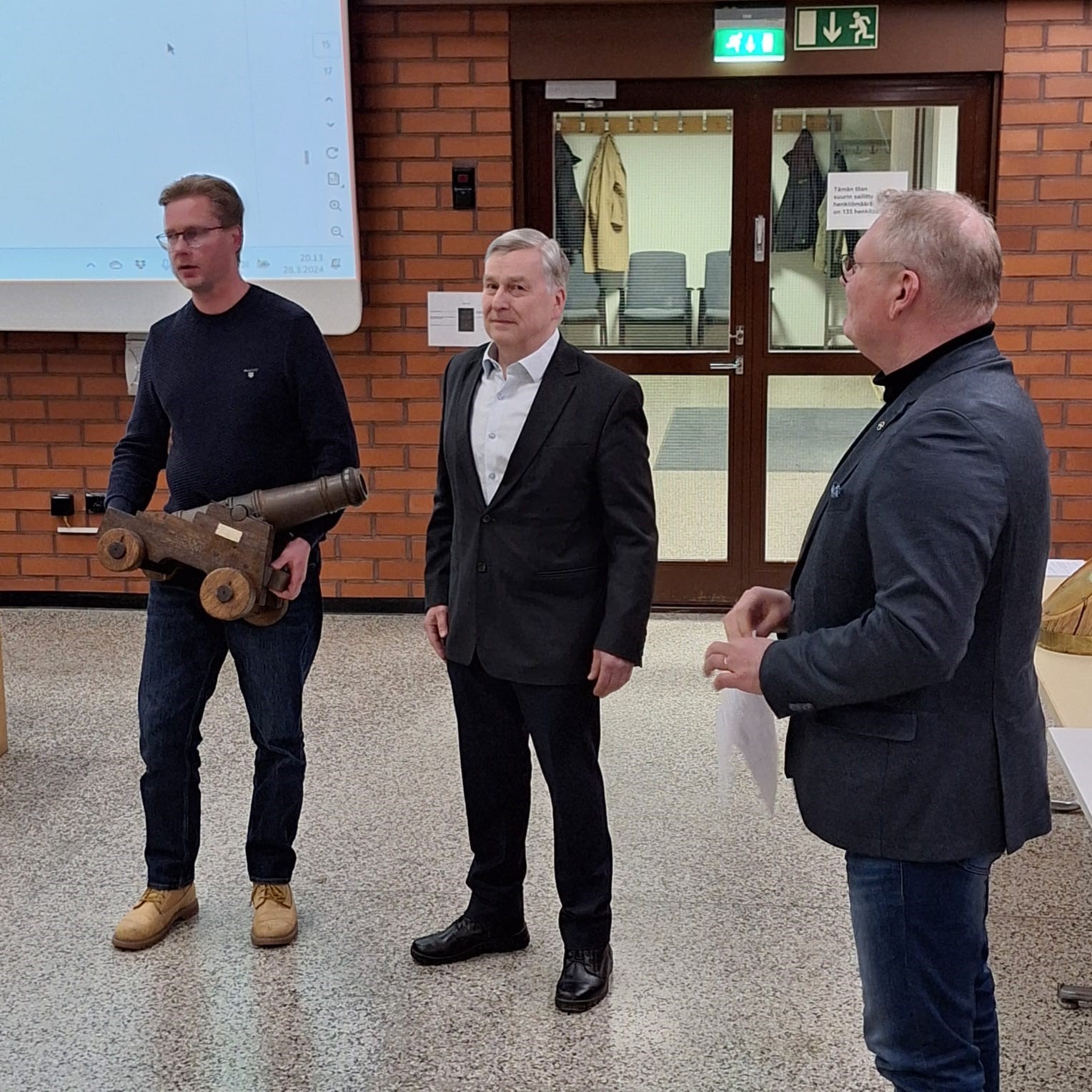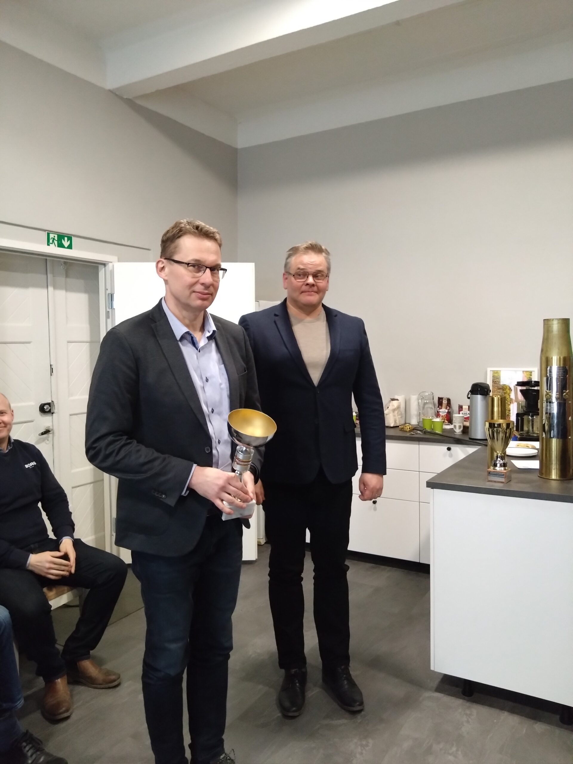 Kokouksen päätteeksi oli viime vuoden palkitsemisten aika. Nuorten palkinnolla on tapana ollut olla kadoksissa palkintojen jaon aikana. Viime vuonna saatiin kiertopalkinnoksi Pentti E.J. Uotilan lahjoittama iso tykin ammuksen hylsy ajatuksella ettei katoaminen ole kovin yksinkertaista. Sen verran tälläkin kertaa oli jännitystä ilmassa, kun Jari Rantanen kertoi palkinnoista esitetystä valokuvasta, että siitä puuttuu nuorten palkinto. Varapuheenjohtaja Petteri Jyrämö kuitenkin vapautti kuulijat kertomalla, että hylsy oli ollut kaiverrettavana palkintopöydän kuvaamisen aikana.