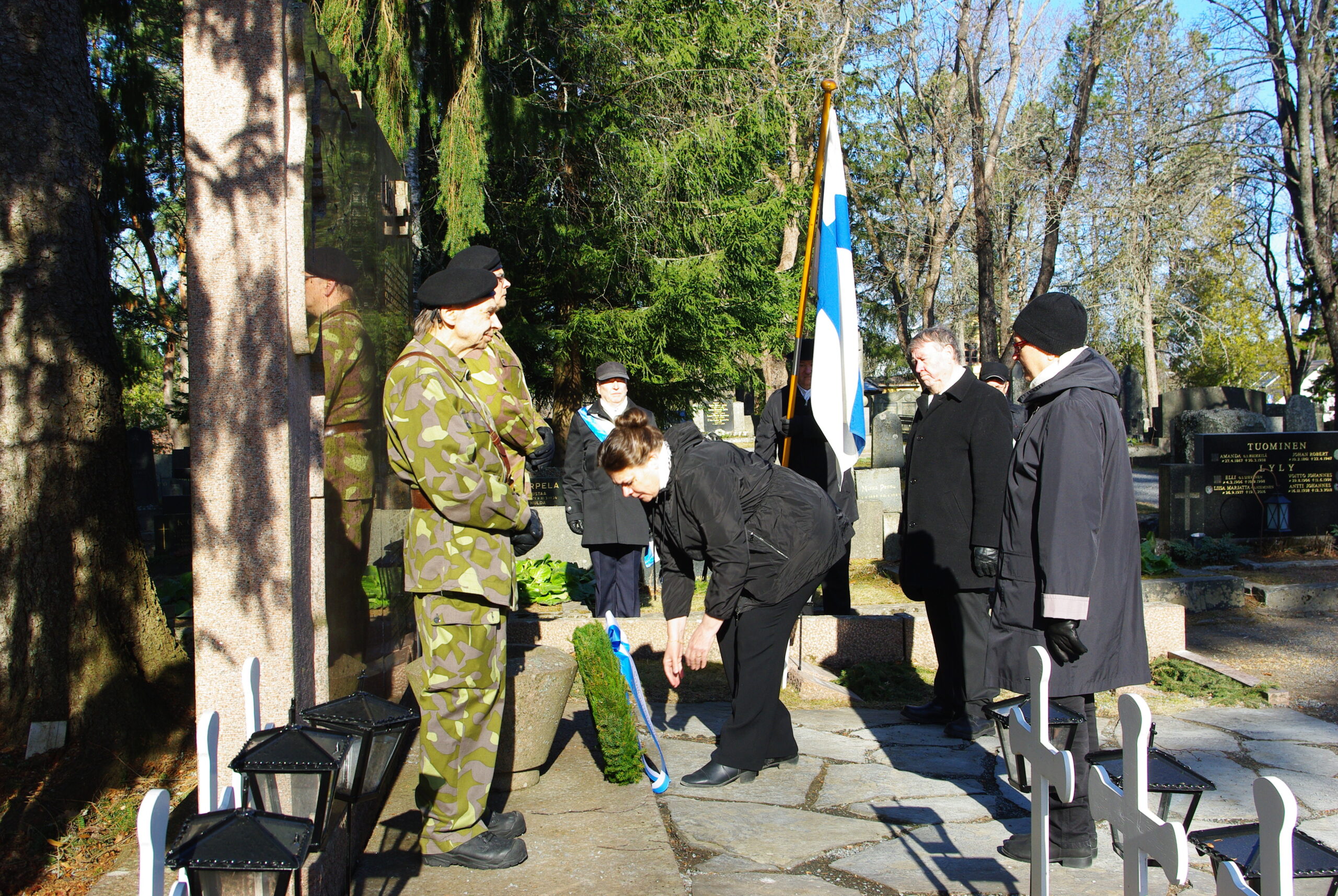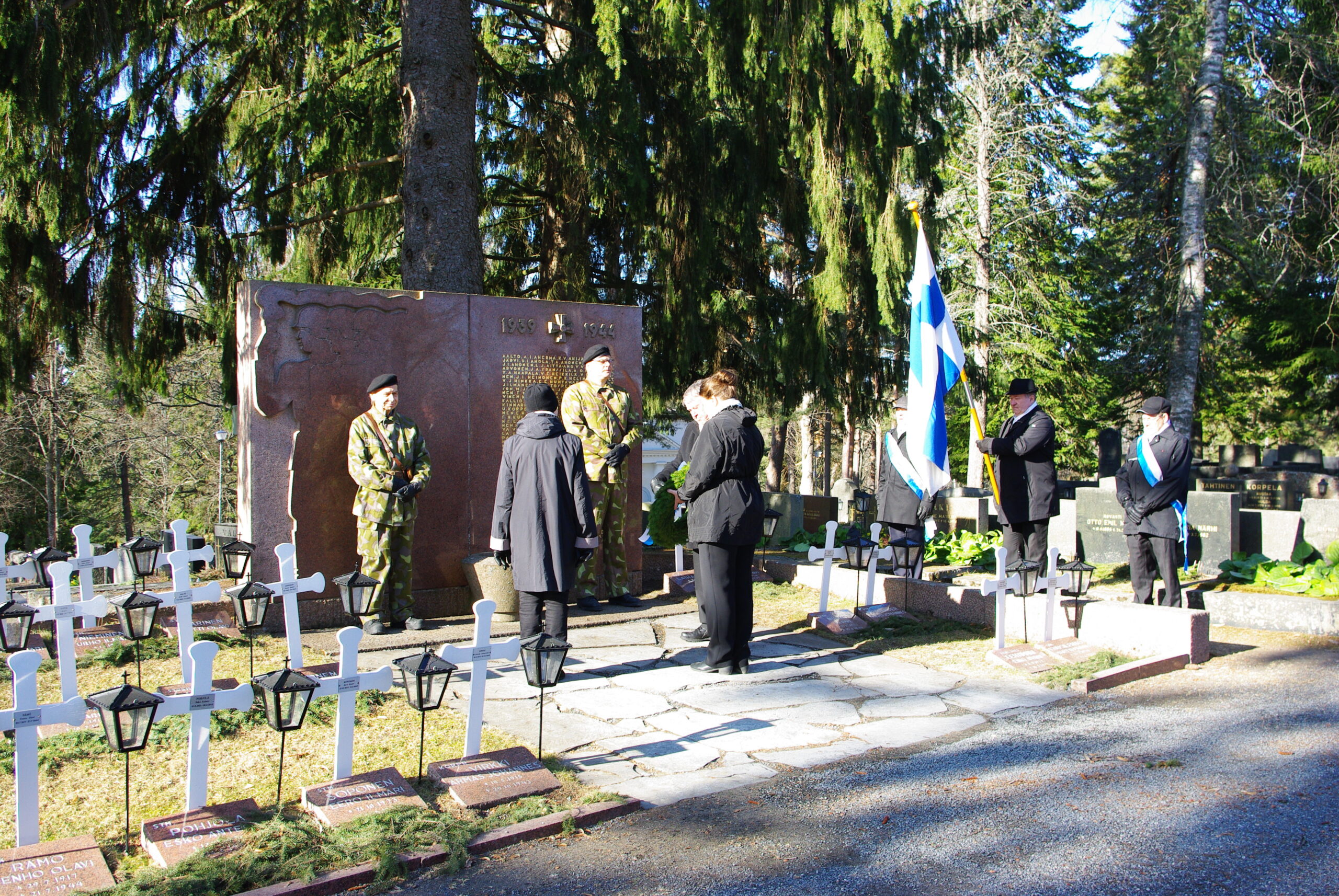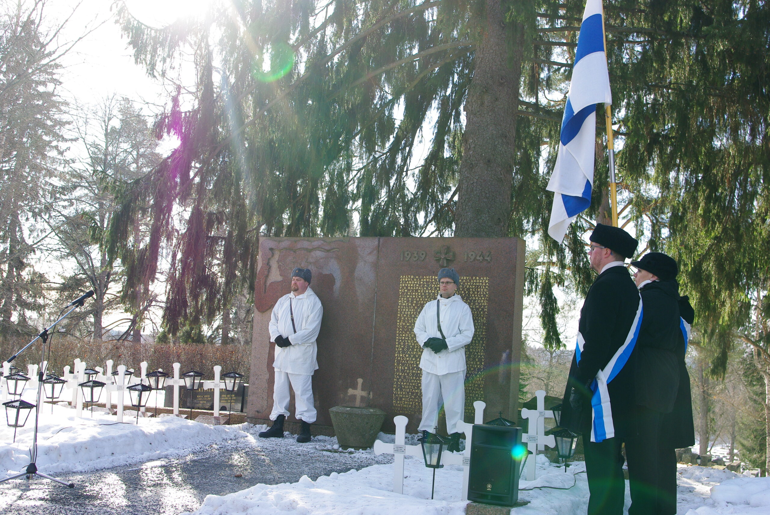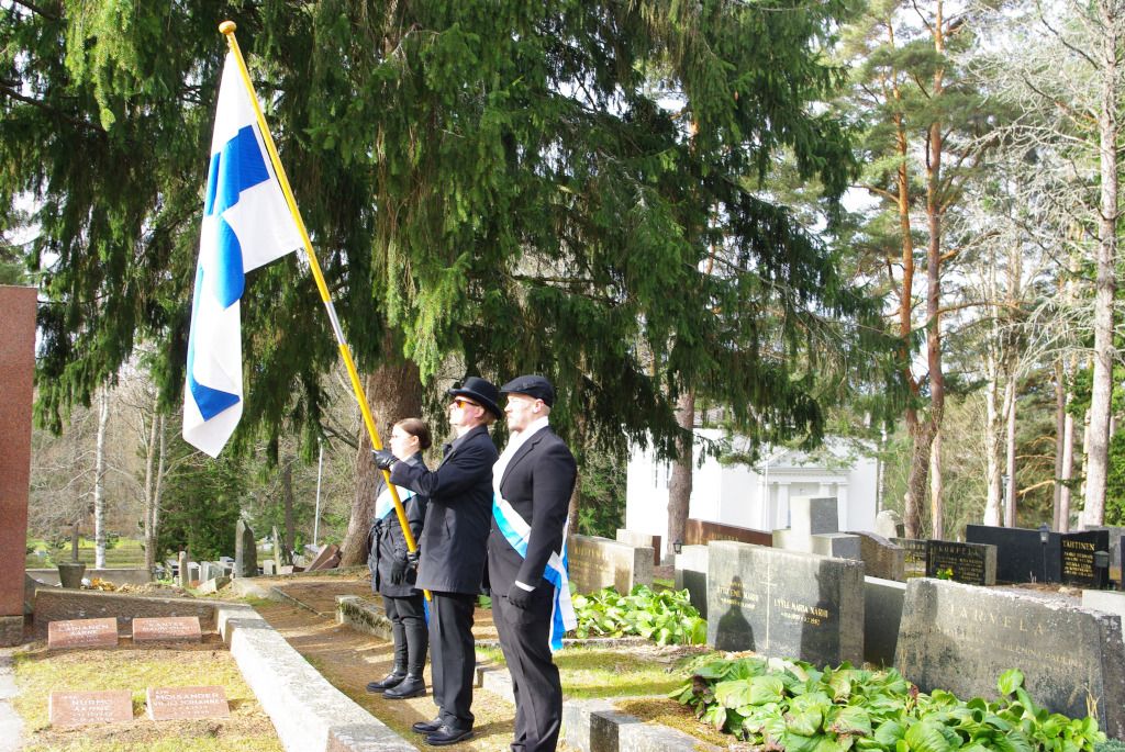 Kunniavartion Sankarihaudalla muodostivat Mikko Soini (oik.) ja Juuso Hyvärinen. Lippuvartiossa Ossi Reini lipunkantajana ja airueina Tuija Leppimäki ja Petteri Jyrämö (oik.). Kuvaajana toimi Laura Leppimäki.