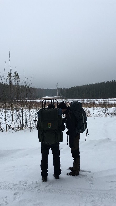 Hiihtopäivän keli oli voitelujen ja latupohjan suhteen vaikea, sillä kymmeniä päiviä jatkunut sydäntalven pakkasjakso vaihtui juuri hiihtoa edeltävänä päivänä suojakeliksi. Aamupäivällä saatiin hiihtoa taittaa vielä mukavassa poutasäässä mutta iltapäivän puolella lämpötila nousi jo +3 C asteeseen ja toi mukanaan myös tihkuisen vesisateen. Tämä johti siihen, että meidänkin ryhmämme teki reitin varrella suksihuoltoa ja monenlaista liisteriä ammennettiin repuista levitettäväksi suksien pohjaan. Toinen hyväksi todettu vaihtoehto oli käyttää ei-voideltavaa suksea ja täysi variaatio pitopohjasuksia tuntui olevan käytössä zero-, nano- ja skin-suksineen. Koska reitti poikkesi Vampulan ulkoilumajan tasalla useammankin kerran, oli myös suksien vaihto mahdollinen ja sitäkin optiota hyödynnettiin.