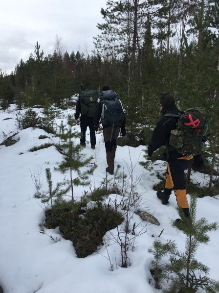 Maastossa kierrettiin lenkki lähimaastossa, jonka aikana ammuttiin sekä kasa-ammunta pistoolilla että ampumahiihtotauluun kiväärillä. Kävelyn osalta piti totutusti pystyä tekemään mahdollisimman lähellä toisiaan olevat kierrosajat.