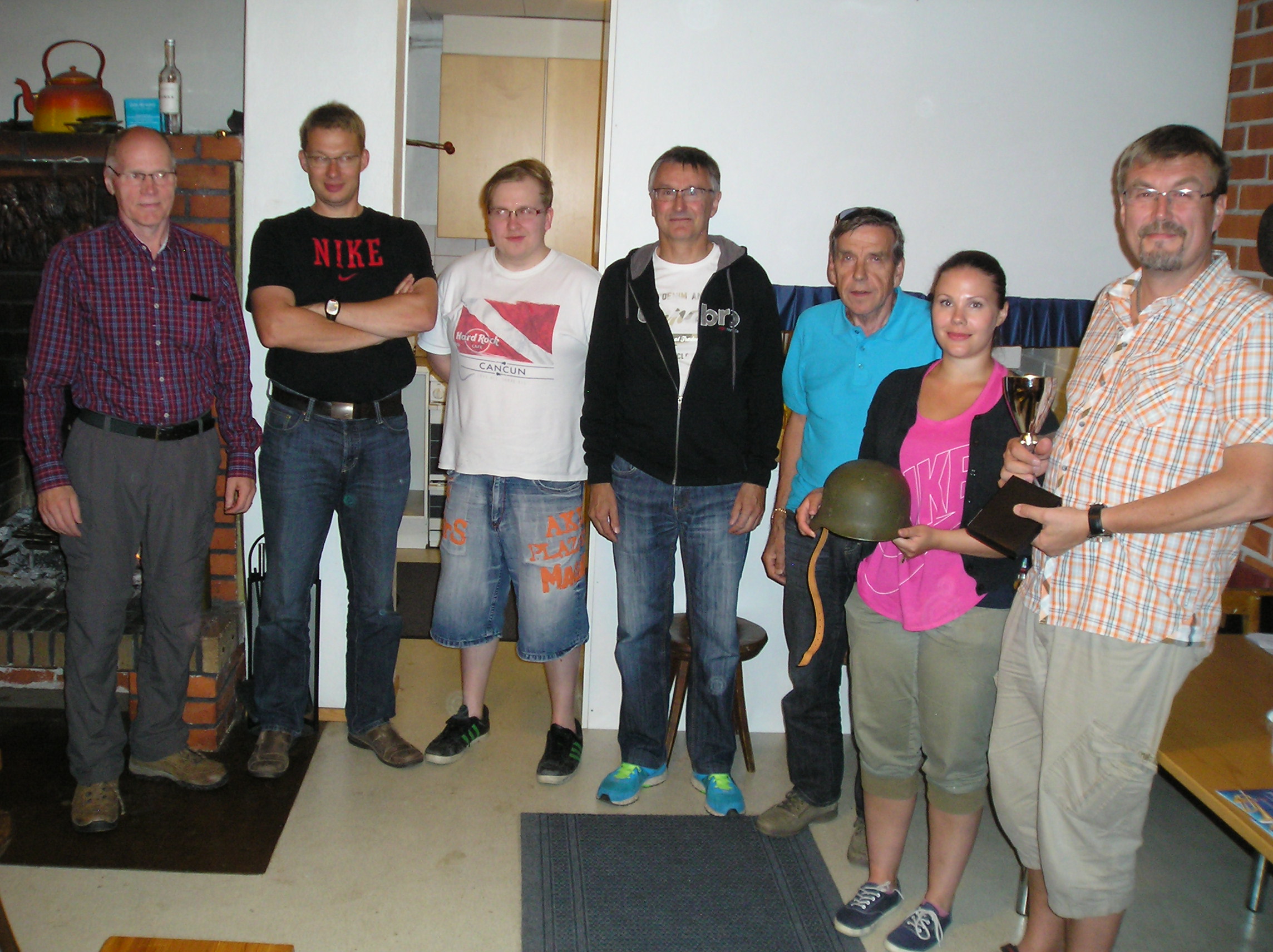 Ampumakävelyyn osallistui nuorempia ja vanhempia jäseniä: takana vasemmalla vanhempaa kaartia Raimo Linnala ja Erkki Väisänen, takana oikealla nuorempia herroja Ville Hölttä ja Jussi Pekkala. Edessä selin vasemmalla Jarkko Järvenpää ja Timo-Pekka Kallioniemi.