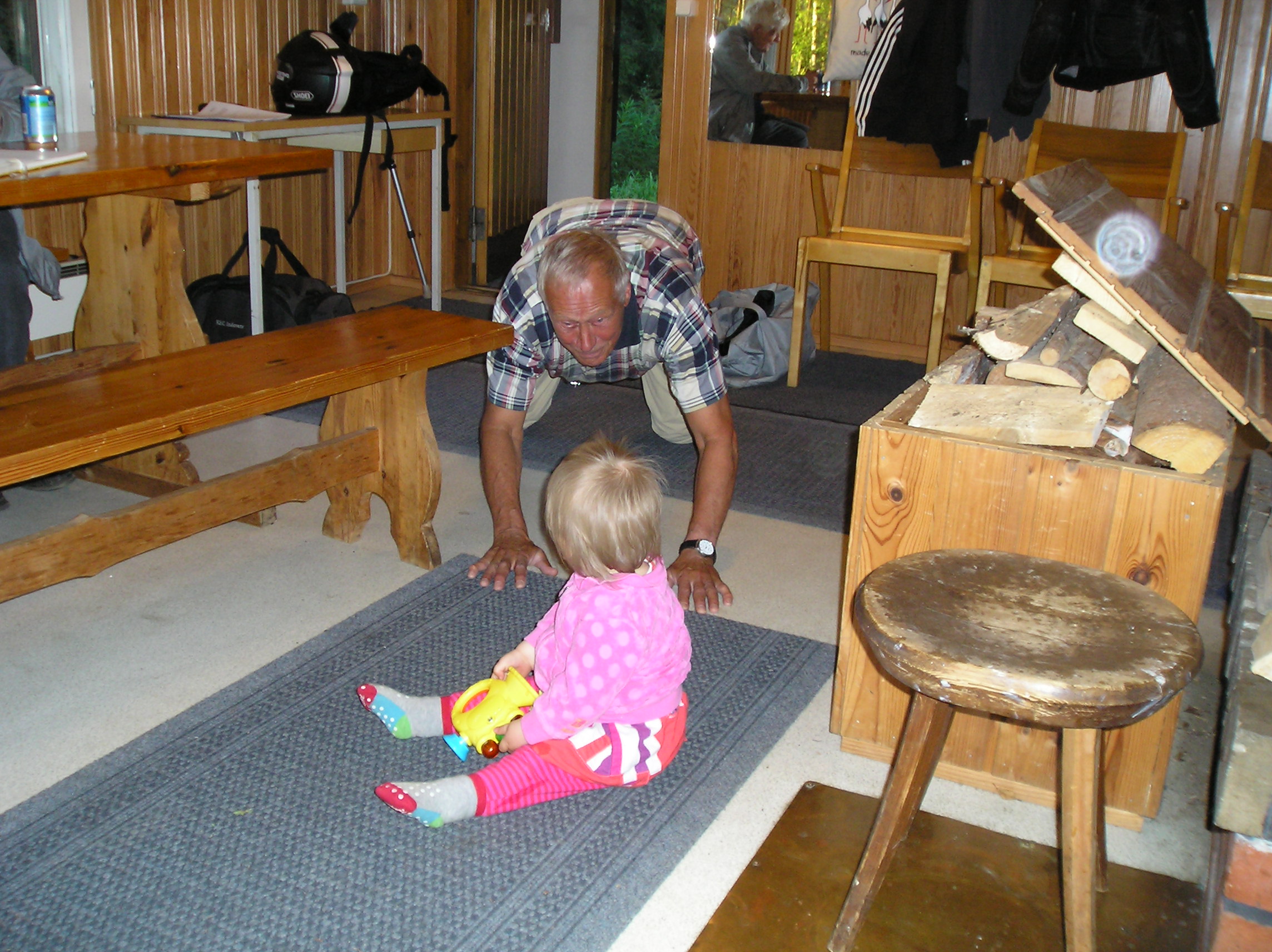 Sirolan Jaakko leikkimässä tilaisuuden nuorimman osanottajan Hilla Kuitusen kanssa.