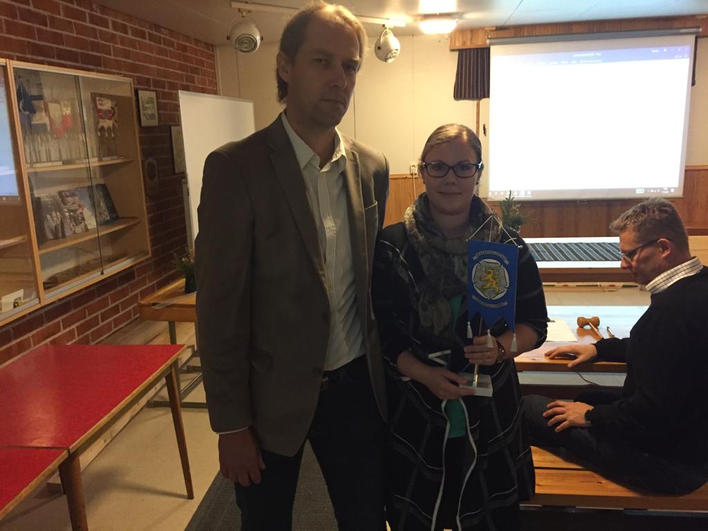 - Petri Airaksinen ja huomionosoituksen saaja Sanna Jaakola yhteiskuvassa. Taustalla kokouksen puheenjohtajana jämäkästi toiminut Raimo Antila.
