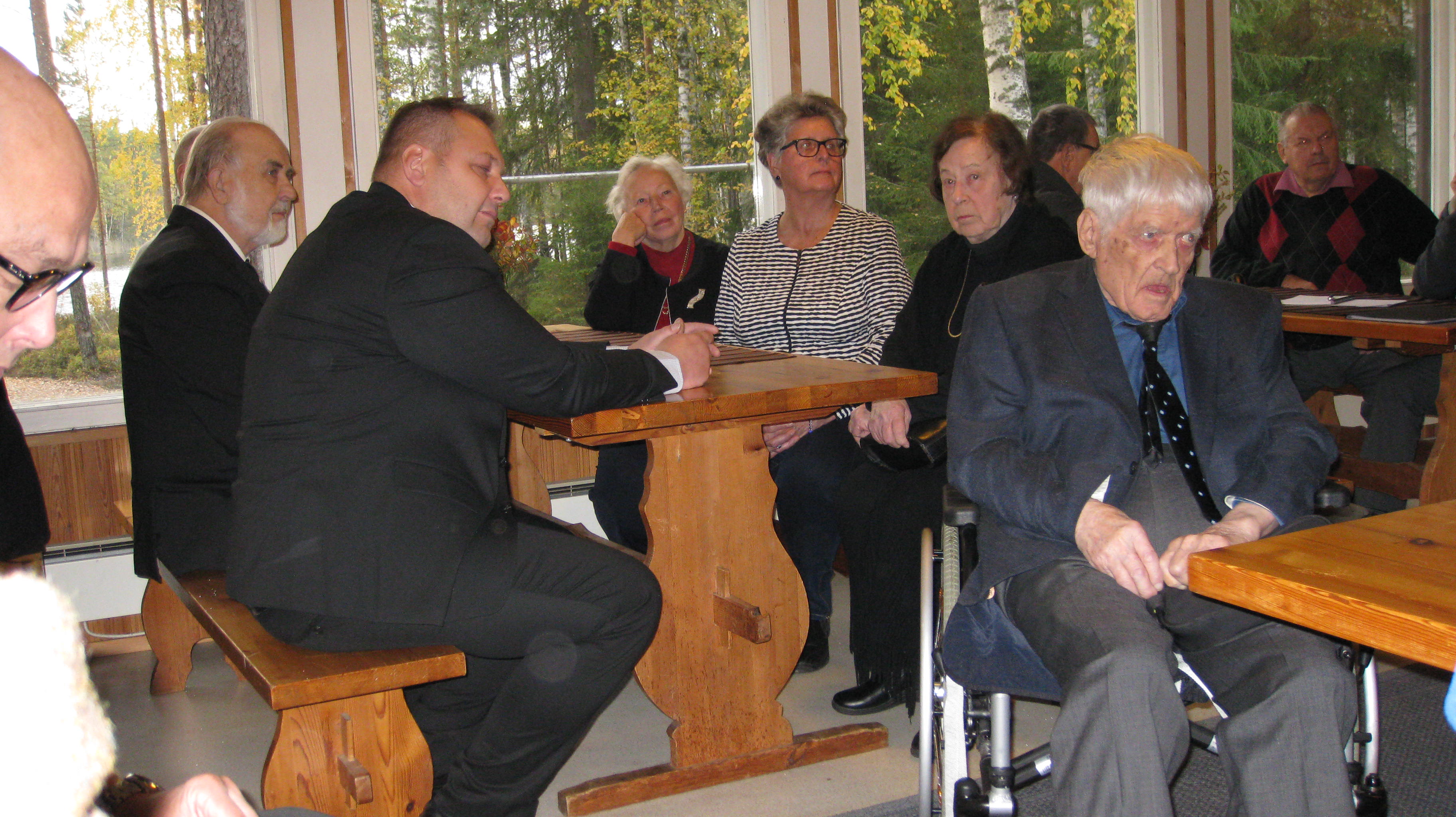 Seppeleen ja kynttilöiden laskemisen jälkeen puheenjohtaja Jari Rantanen, varapuheenjohtaja Petteri Jyrämö ja emerituspuheenjohtaja Jaakko Sirola tekivät tervehdyskäynnin 90-vuotiaan kunniapuheenjohtajan Pentti E.J.Uotilan luona.