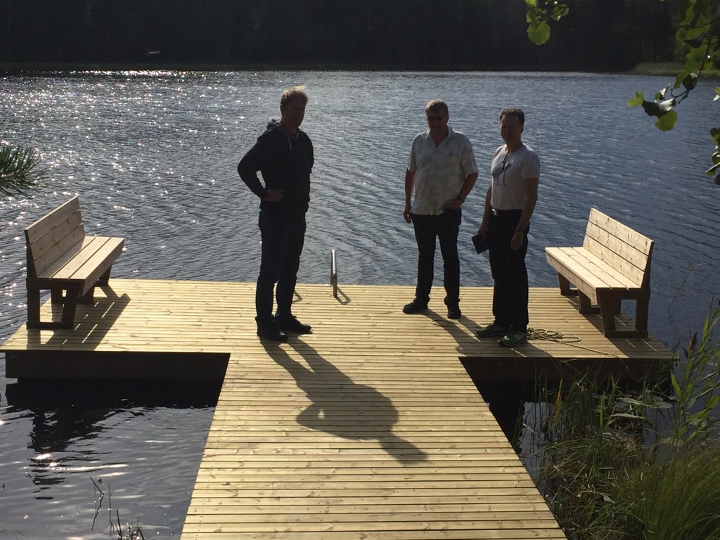 - Hallitus piti kokouksen laiturin valmistumispäivänä. Lopputulosta ihailemassa Petri Airaksinen, Saajanmaja vastaava Matti Koppanen ja samana päivänä 50-vuotta täyttänyt Marko Mahkonen.