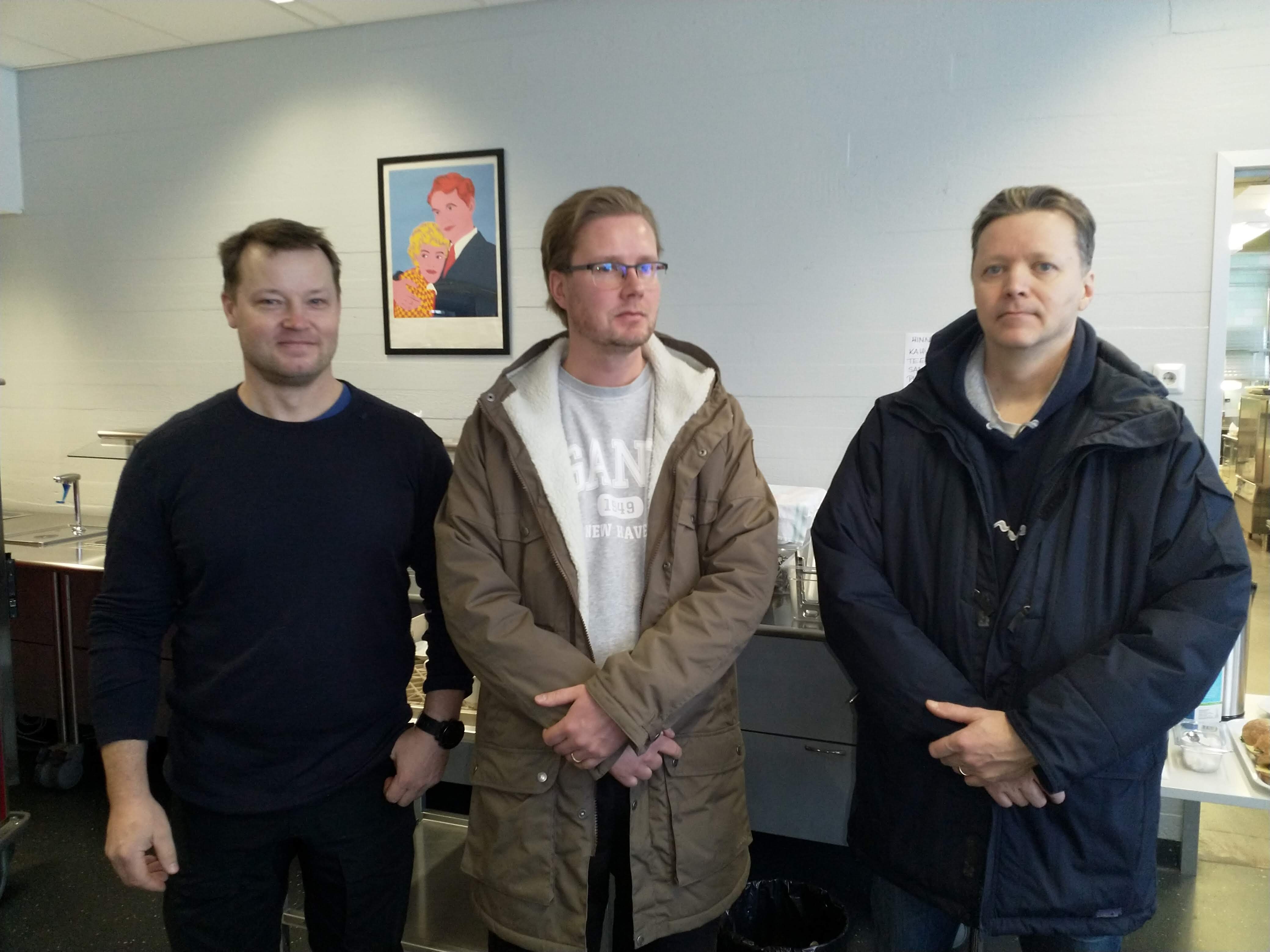 Majoituksessa vas. Timo-Pekka Kallioniemi, Matti Kärenlampi ja Jari Rantanen. Rantasen juniorit seuraavat isän jalanjälkiä.