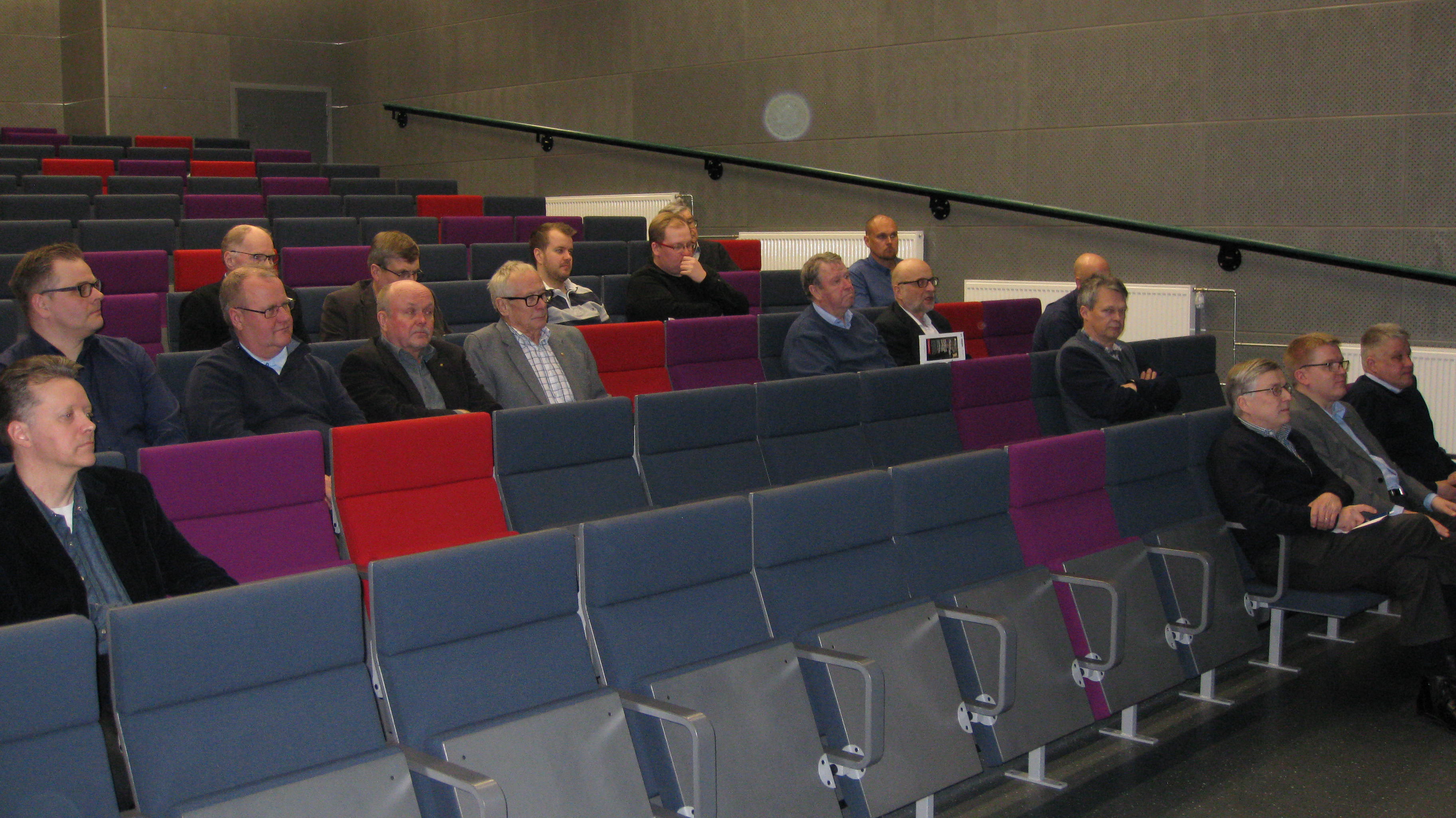 - Kokousväki tarkkana. Eturivissa vas. Jukka Yrjölä, piirinpuheenjohtaja Matti Vainio ja MPK:n apulaispiiripäällikkö Sauli Mäenalusta