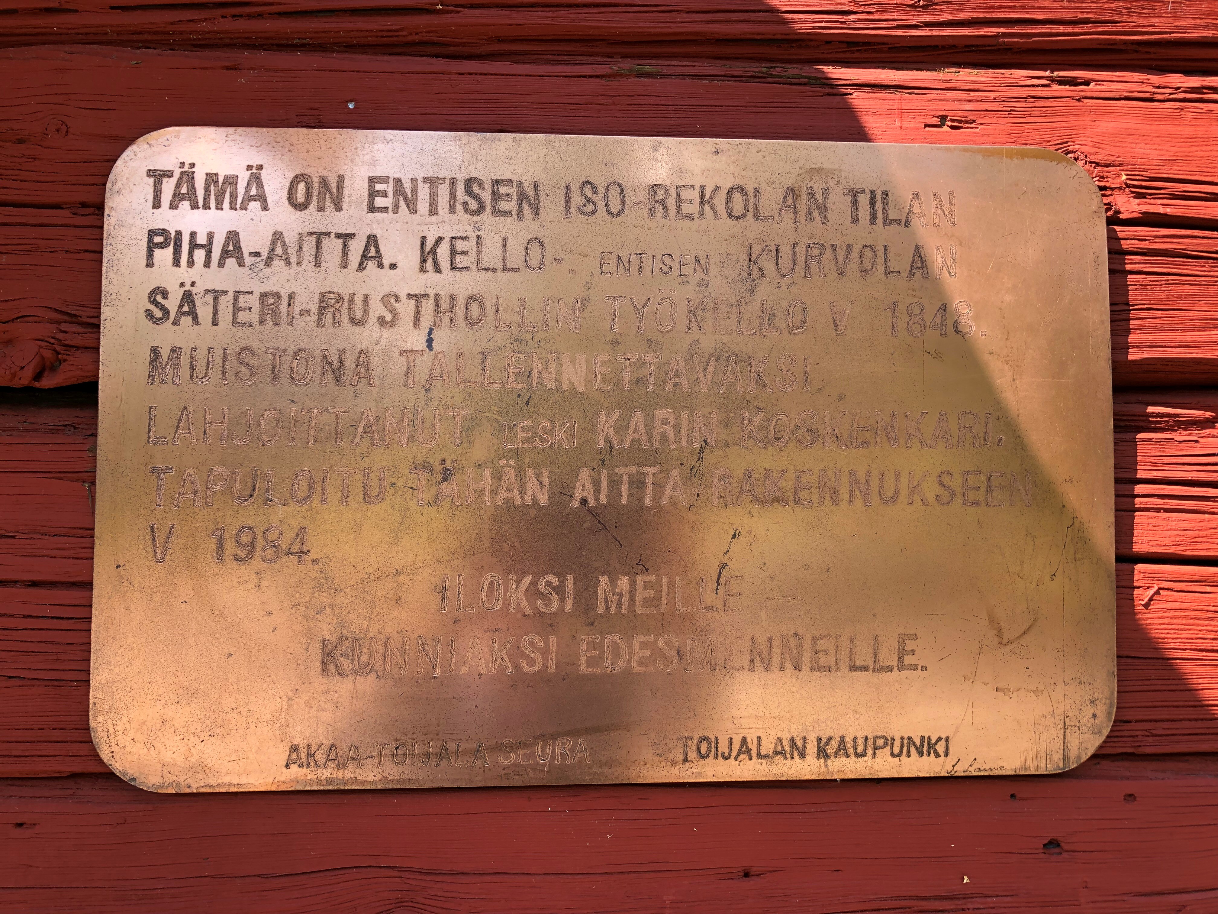 Aitan seinässä laatta: ”Tämä on entisen Iso-Rekolan tilan piha-aitta. Kello entisen Kurvolan Säteri-Rusthollin työkello v 1848 muistona tallennettavaksi. Lahjoittanut leski Karin Koskenkari. Tapuloitu tähän aitta-rakennukseen 1984. Iloksi meille kunniaksi edesmenneille. Akaa-Toijala seura, Toijalan kaupunki”.
