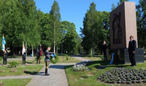 Seppelpartio laskee seppeleen Suru ja usko tulevaisuuteen -muistomerkille