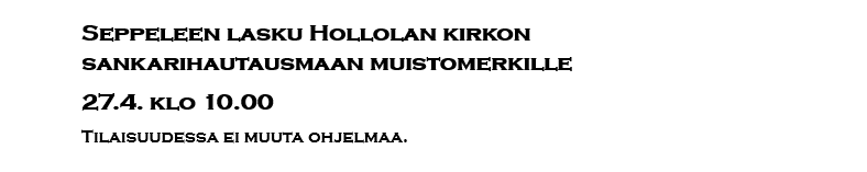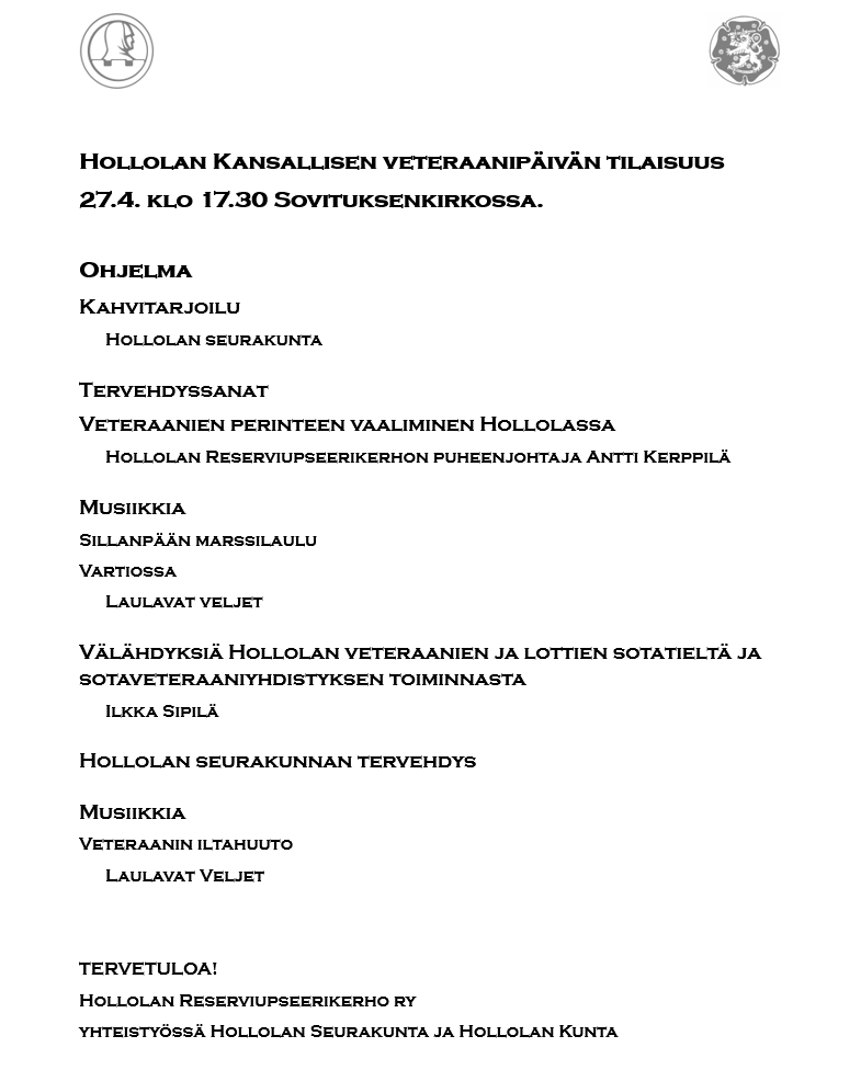 Hollolan Kansallisen veteraanipäivän juhla 27.4. klo 17.30 Sovituksenkirkossa ja seppeleen lasku sankarihaudalle
