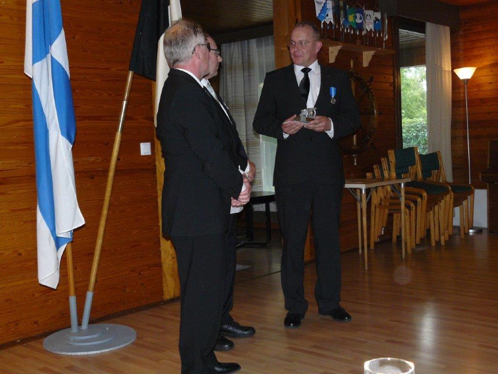 Kuvissa Pekka Mertakorpi on luovuttamassa Suomen reserviupseeriliiton pronssista ansiomitallia Johannes Niemeläiselle.