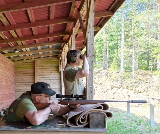 Kasa-ammunta meneillään. Ampumassa Markku Ranta-aho ja tarkkailemassa Raimo Hevosmaa.