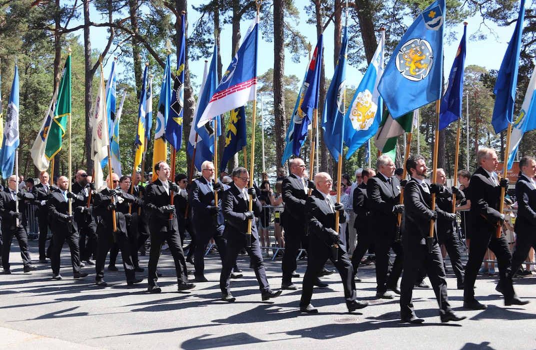 Maanpuolustusjärjestöjen lippulinna. Jokelan Reserviupseereiden lipun tunnistaa siinä olevasta tiiliraidasta. Kuva Sami Hänninen.