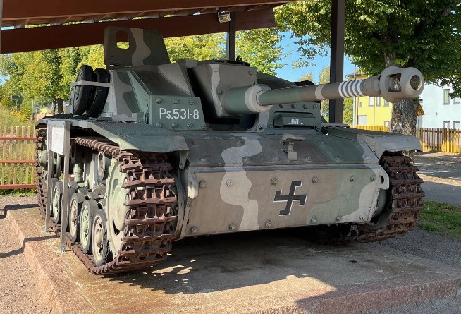 Rynnäkkötykki Sturm, lempinimeltään Aili. Torjuntataisteluissa kesällä 1944 Tali-Ihantalassa ja Vuosalmella Aili tuhosi viisi vihollisen panssarivaunua, mistä kertovat myös tykissä olevat viisi valkoista raitaa.
