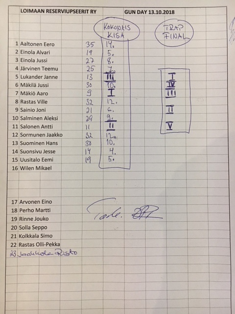 Vaikka kyse olikin enemmän harjoittelusta ja taitojen testaamisesta, ei kilpailuhenkeä voitu välttää. Kolmen ammuntaosion yhteenlaskettujen tulosten paras oli Aaro Mäkiö, kakkoseksi tuli Antti Salonen ja kolmanneksi Janne Lukander. Trap-finaalin voitti Janne Lukander Jani Sainion tullessa toiseksi ja Aaro Mäkiön kolmanneksi.