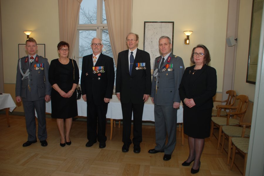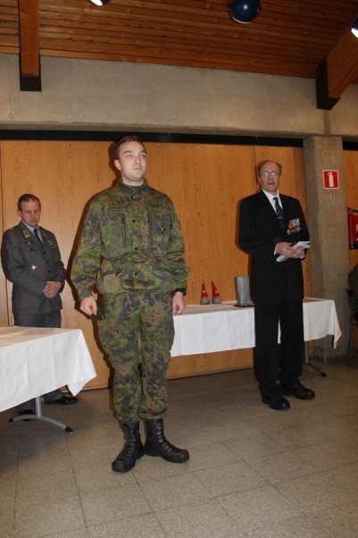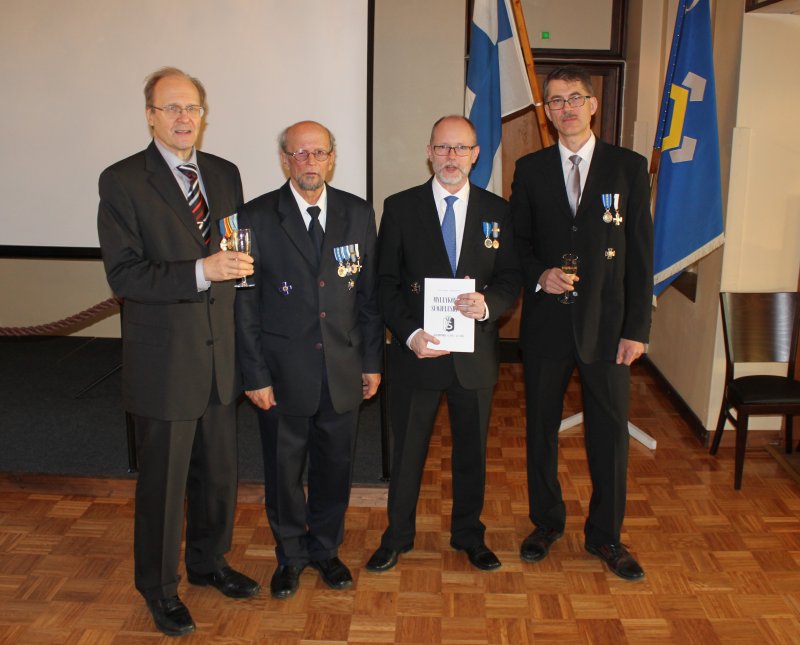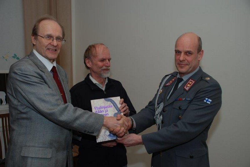 - 80v juhlivan Haminan Reserviupseerikerhon edustajat keskellä (vas.) vastaava toimitussihteeri, kapteeni Jarkko Tawast ja (oik.) puheenjohtaja, kapteeni Ari Falkenberg.