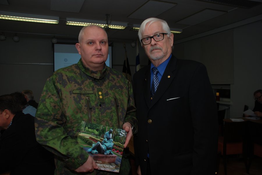 - Kevätkokouksen esitelmöitsijä everstiluutnantti Pentti Forsström palkittiin kirjalla. Mukana InkUK:n kapteeni Lassi Kujala.
