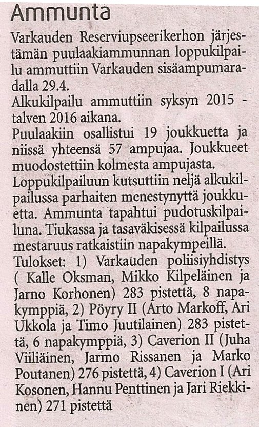 Puulaakiammunnan finaalin tulokset Warkauden Lehdessä 1.5.2016.
