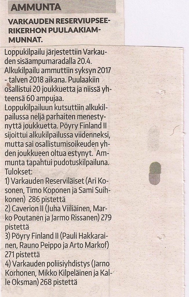 Puulaakiammunnan finaalin tulokset Warkauden Lehdessä 23.4.2018.