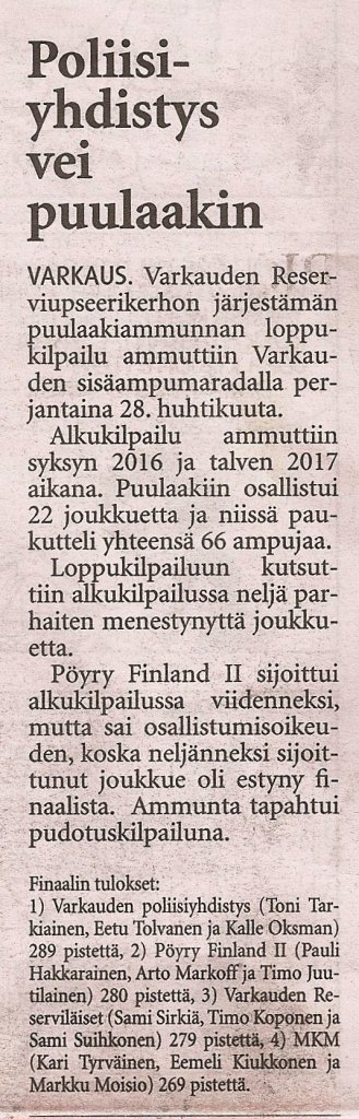 Puulaakiammunnan finaalin tulokset Warkauden Lehdessä 30.4.2017.
