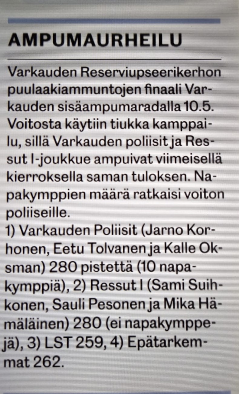 Puulaakiammunta finaali Warkauden lehdessä 30.4.2025.