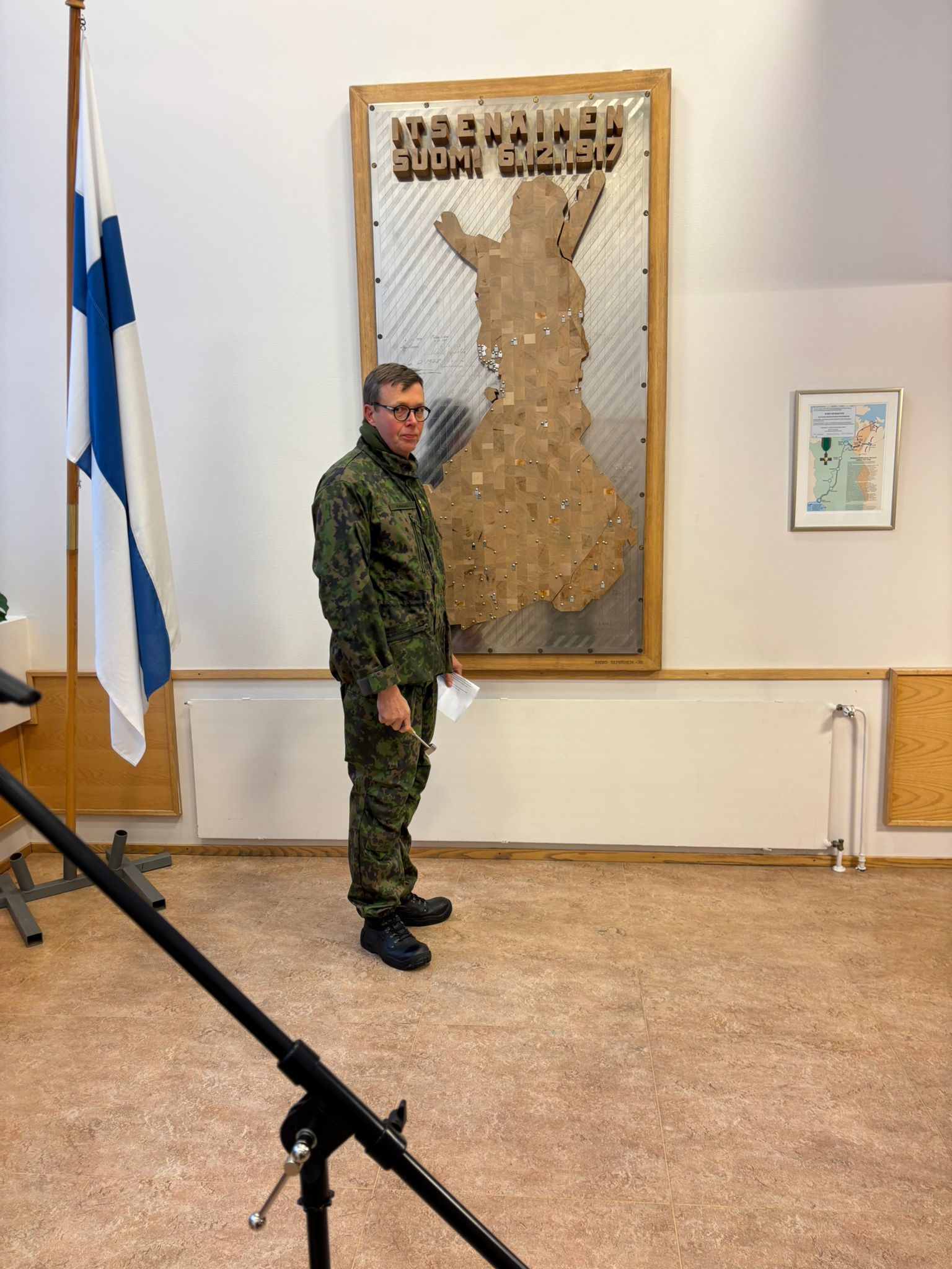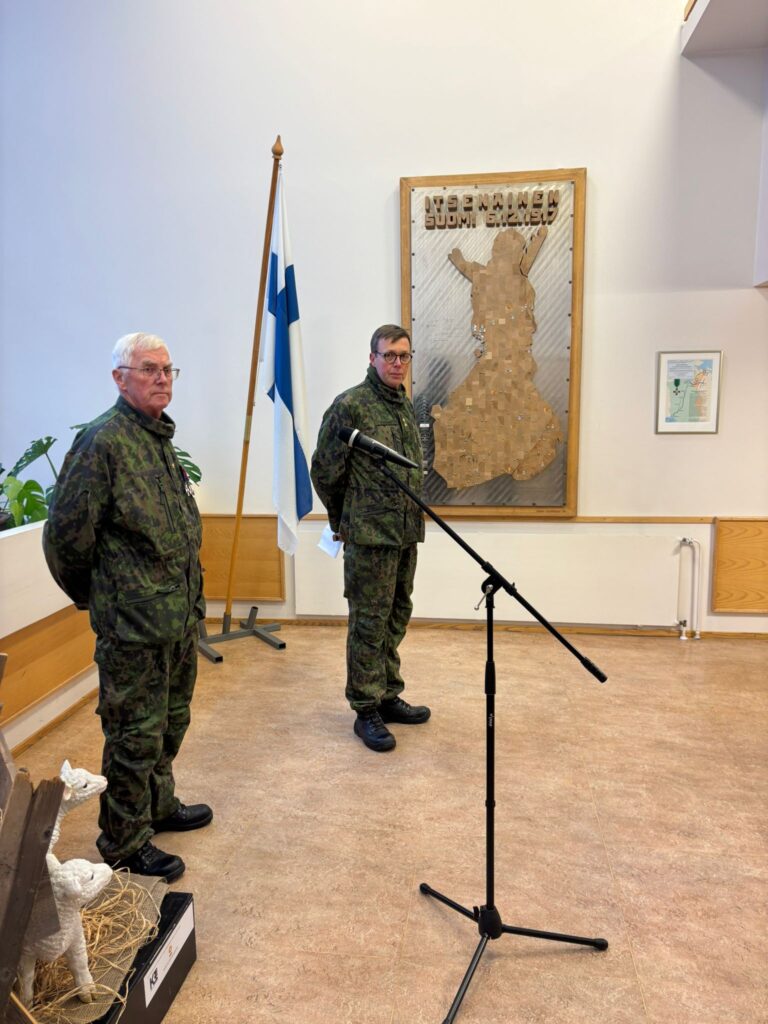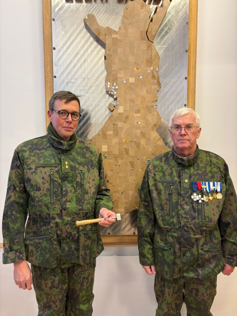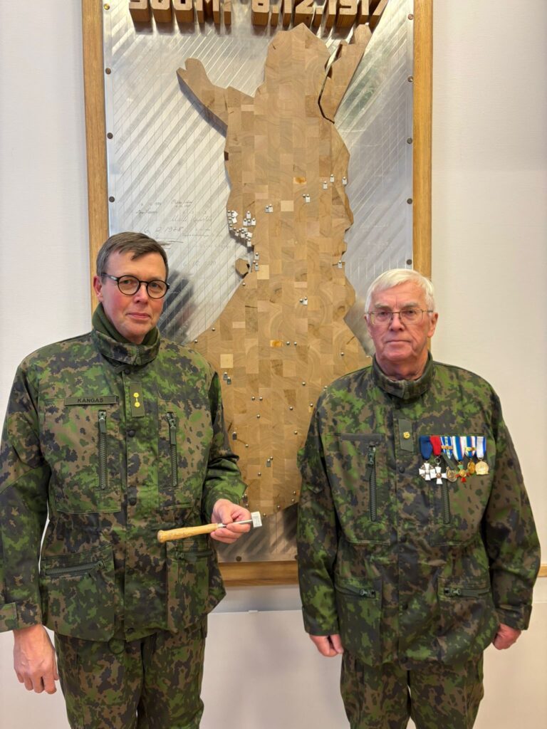 Itsenäisyyspäivän juhlatilaisuudessa Kemin seurakuntakeskuksessa reliefin naulausvuorossa Risto Kangas Veitsiluodon reserviupseereista.