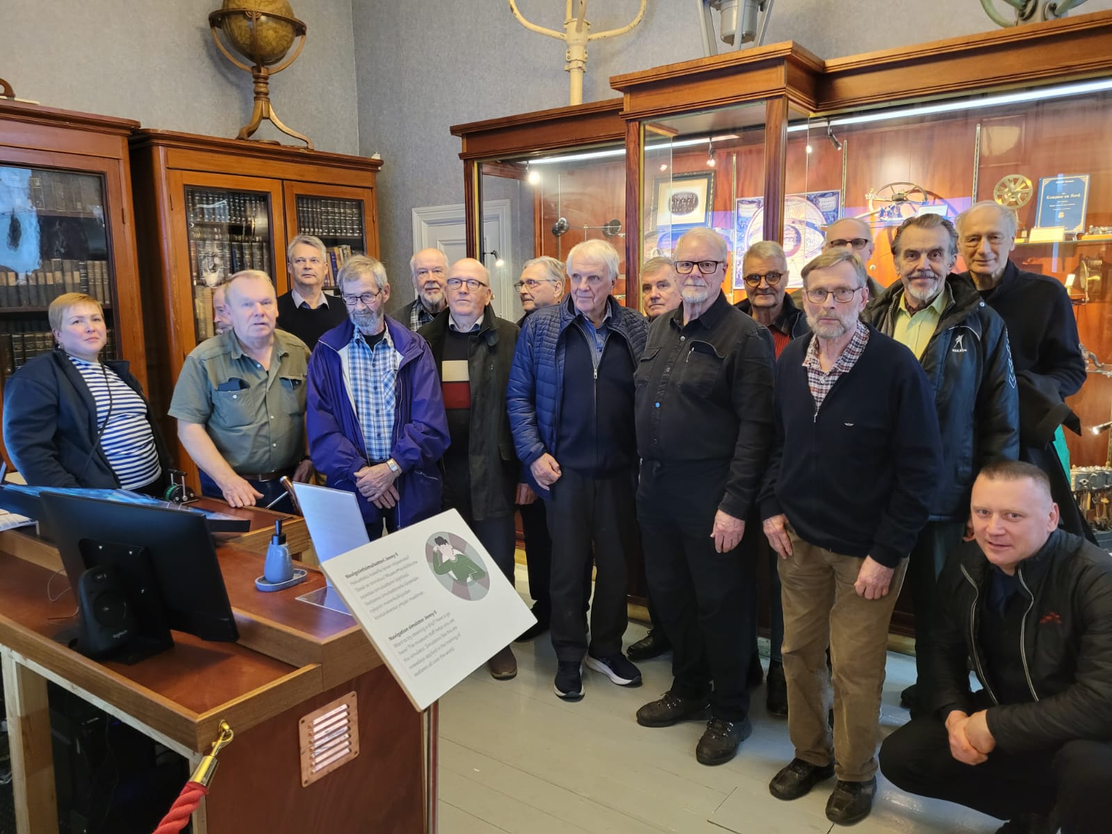 Seuraavaksi matkamme jatkui kohti Raumaa ja sen Merimuseota, jonne saavuimme taas aikataulun mukaisesti. Paikan päällä Museon johtaja Anna Meronen otti meidät vastaan, esitteli se yleisesti ja tämän jälkeen kahteen ryhmään jaettu joukkomme sai mielenkiintoiset opastukset vahvasti merihenkisen museon kokoelmiin. Erityisinä valkeakoskelaisina kytkentöinä museosta löytyi ainakin kaksi kohdetta. Ensimmäinen näistä on ex -pääministeri Jukka Rangellin (1941-1943) veljen, merikapteeni Jaakko Veikon (Veikka) muotokuva tarinoineen, ja tästä veljesparista (JR) on jälkipolvikytkentä VUK:n jäsenistöön. Toinen kytkentä on Valkeakosken uimahallin aulassa olevaan, retkemme johtajan Peterin organisoimaan sukeltajaan (siis puku ja sukeltajanvarusteet ilmapumppuineen) Iisakkiin, jonka ”serkun” tapasimme sijoituspaikallaan museon tiloissa. Toki hieman kotiin päin vetäen on todettava, että meidän Iisakkimme on ainakin kookkaampi ja ehkä hieman ryhdikkäämpikin.